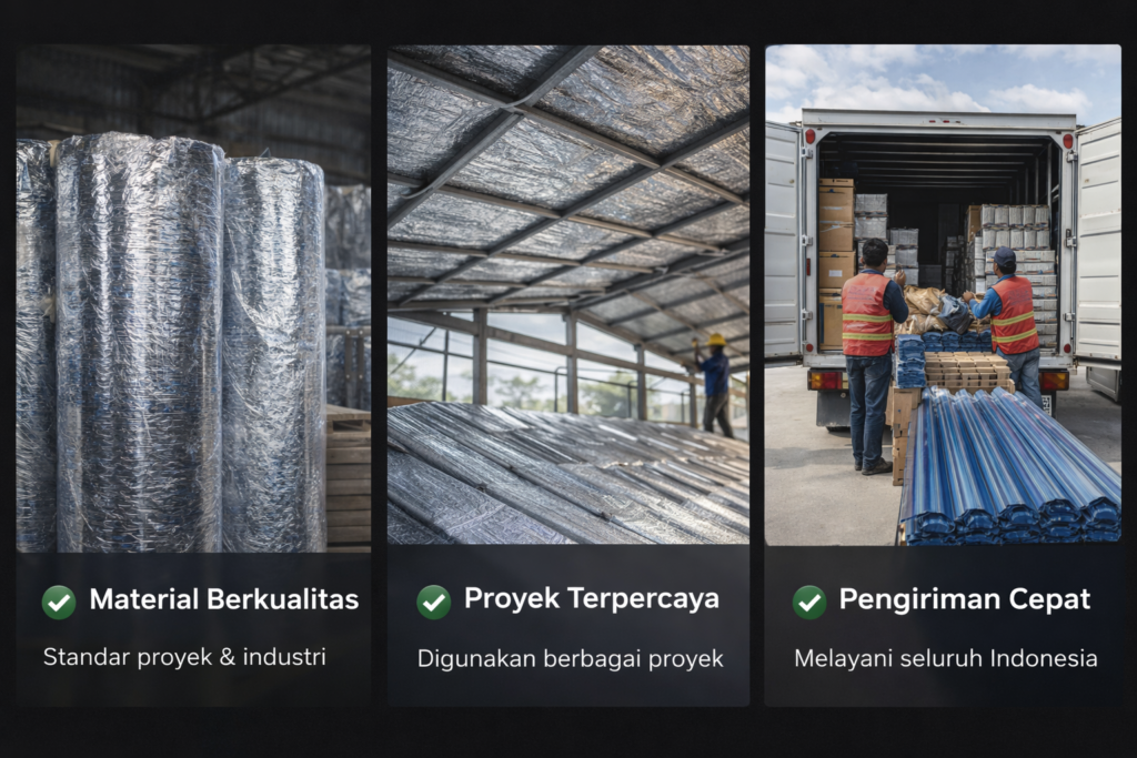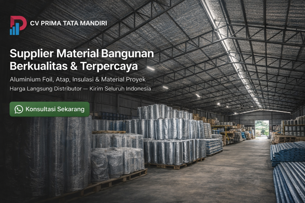 CV Prima Tata Mandiri merupakan supplier material bangunan yang menyediakan aluminium foil insulation, atap, insulasi panas, dan berbagai kebutuhan konstruksi dengan harga langsung distributor. Kami melayani pengiriman ke seluruh Indonesia untuk kebutuhan rumah, gudang, pabrik, maupun proyek konstruksi.