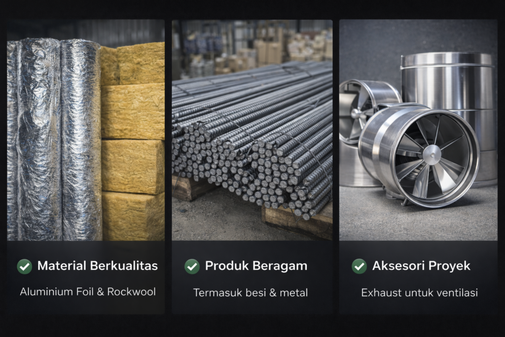 Kami menyediakan berbagai material proyek berkualitas seperti aluminium foil peredam panas, rockwool insulation, besi konstruksi, hingga exhaust fan ventilasi industri untuk kebutuhan rumah, gudang, dan pabrik di Surabaya dan seluruh Jawa Timur.