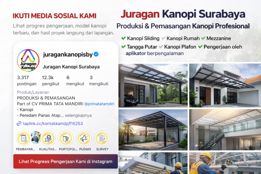 Untuk melihat berbagai model kanopi terbaru, hasil pengerjaan tim kami, serta update proyek yang sedang berjalan, silakan kunjungi Instagram resmi Juragan Kanopi Surabaya.