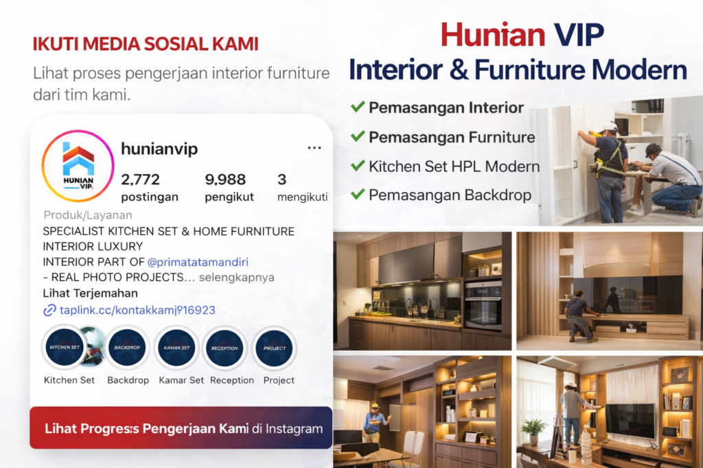 Untuk melihat berbagai hasil pengerjaan interior, desain furniture custom, serta konsep interior terbaru, silakan kunjungi Instagram resmi Hunian VIP.